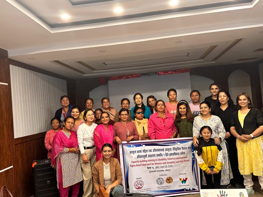 On April 29, 2025 (Baishakh 16, 2082), Federation of Women with Disabilities Nepal (FWDN) organized a “Capacity Building Training on Disability, Historical Development, and Rights-Based Approaches for Women with Disabilities and Their Parents” at Imadol, Lalitpur, with the support of Women Fund Asia and in collaboration with one of the member organization of FWDN Jal Disabled Society, Lalitpur.
